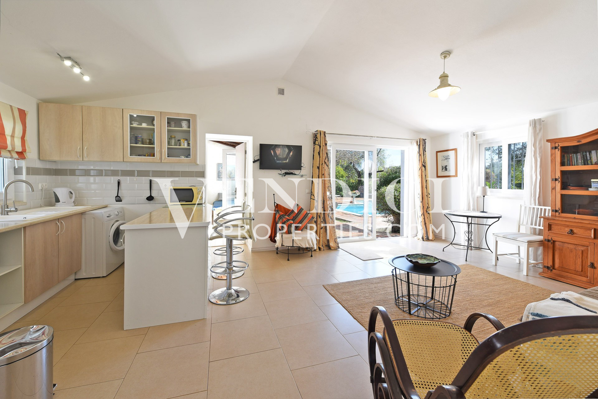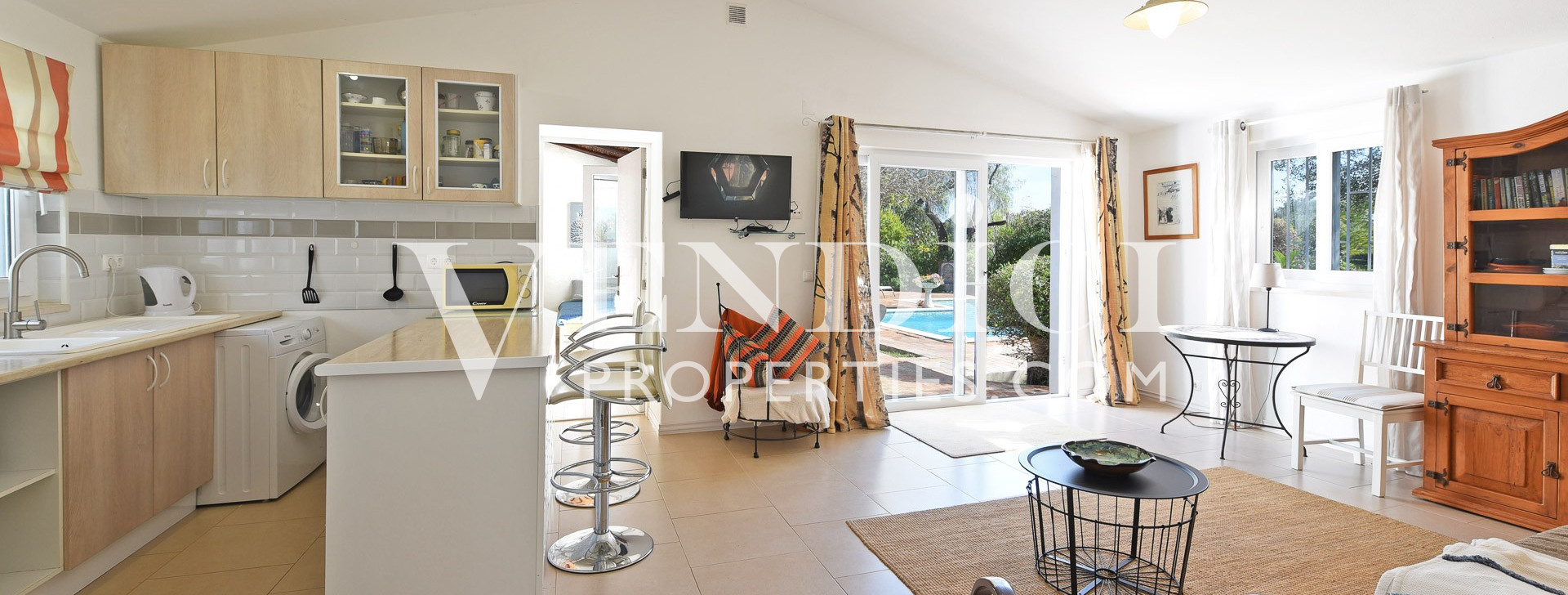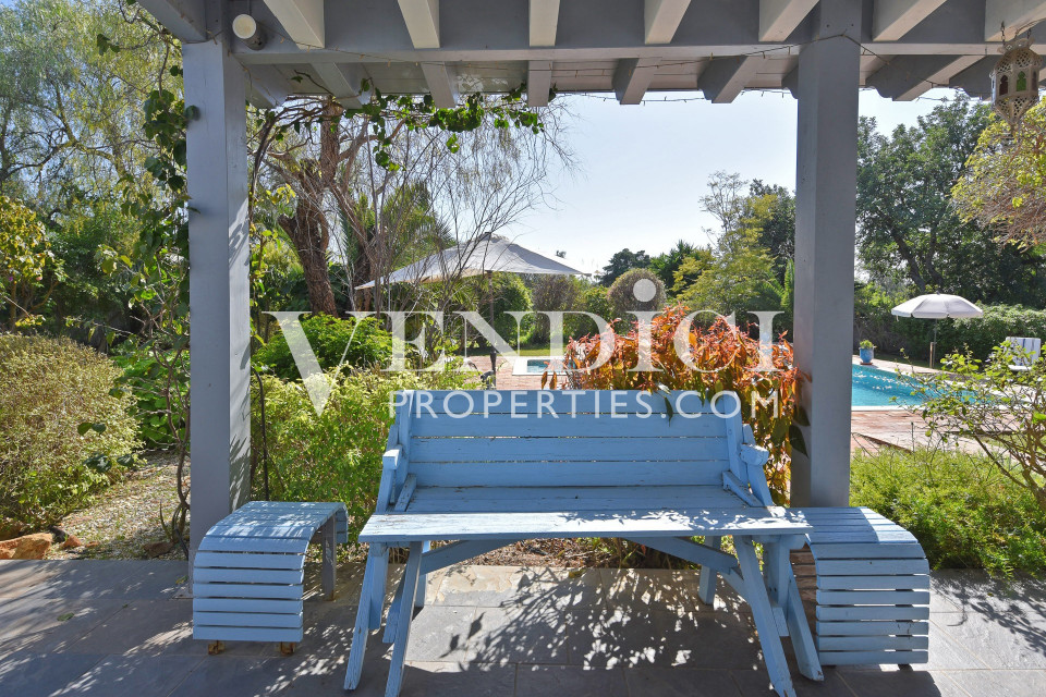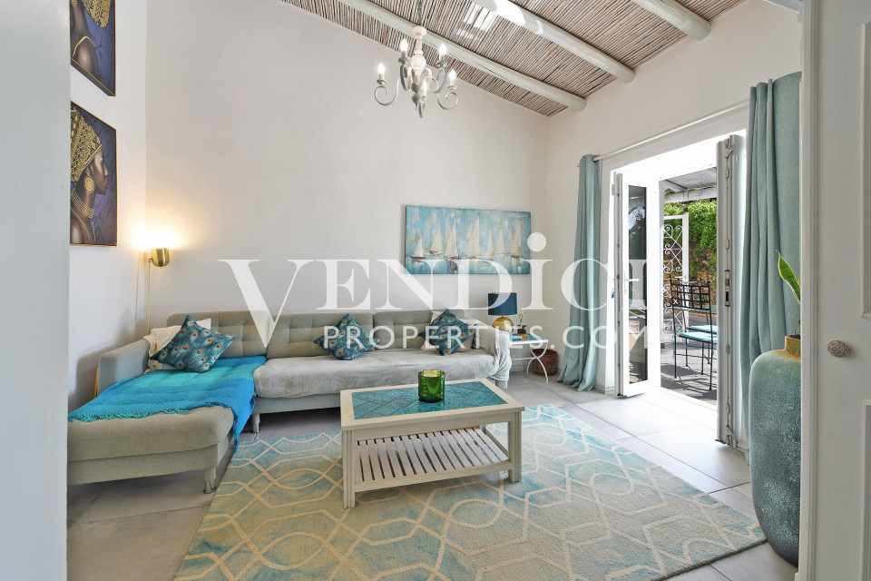 From the living room, patio doors lead out to the covered terrace, pool, and landscaped gardens. A charming, sun-filled snug, tv or reading room adjoins the living area, also benefitting from patio doors that open onto the outdoor terrace.