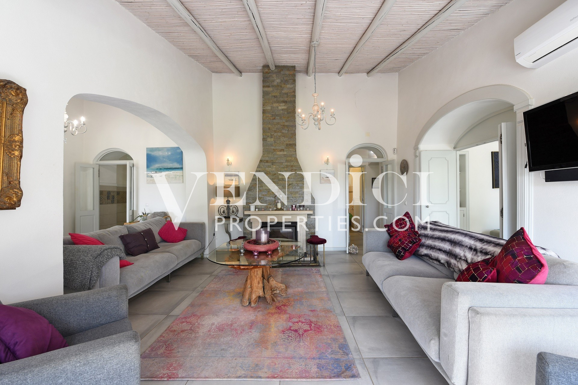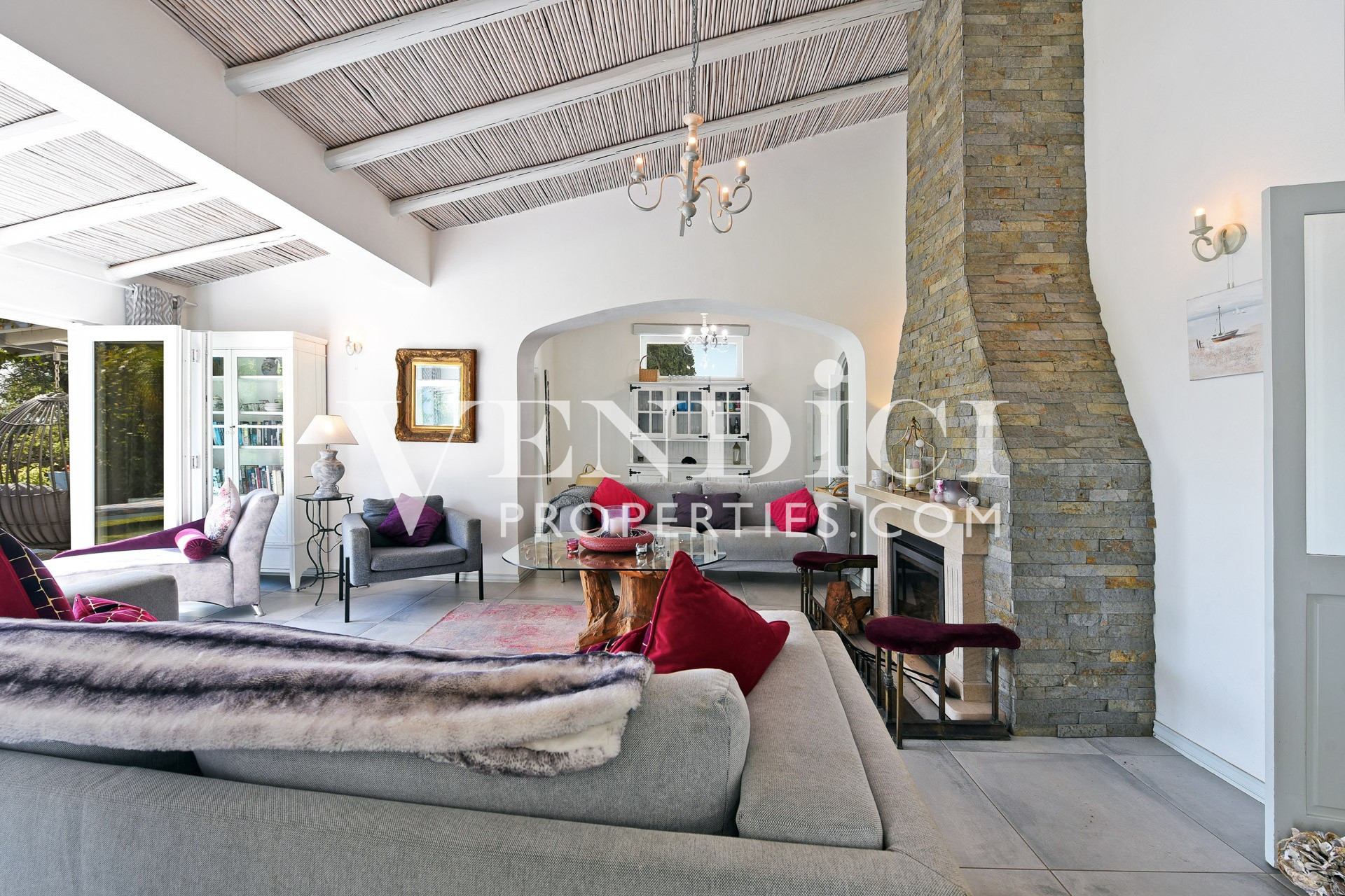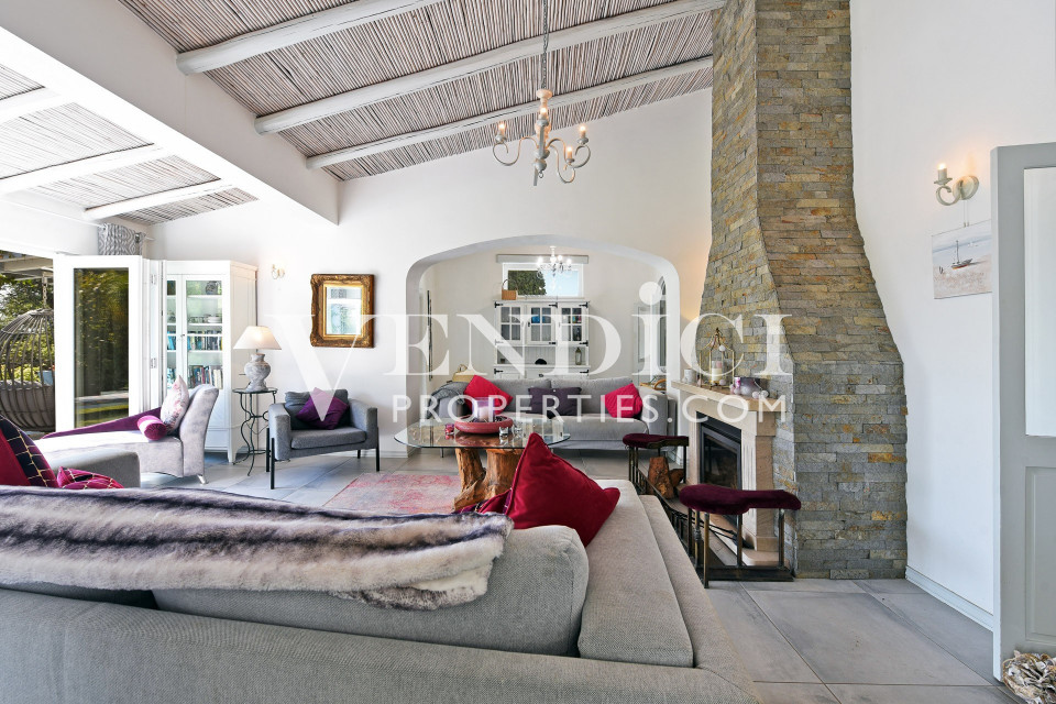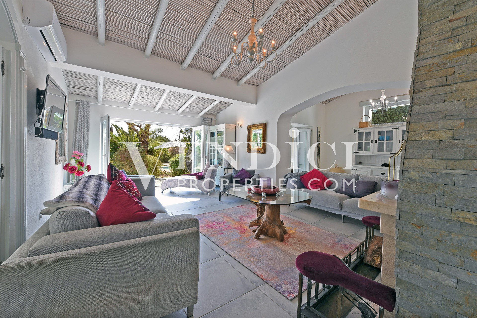 From the living room, patio doors lead out to the covered terrace, pool, and landscaped gardens. A charming, sun-filled snug, tv or reading room adjoins the living area, also benefitting from patio doors that open onto the outdoor terrace.