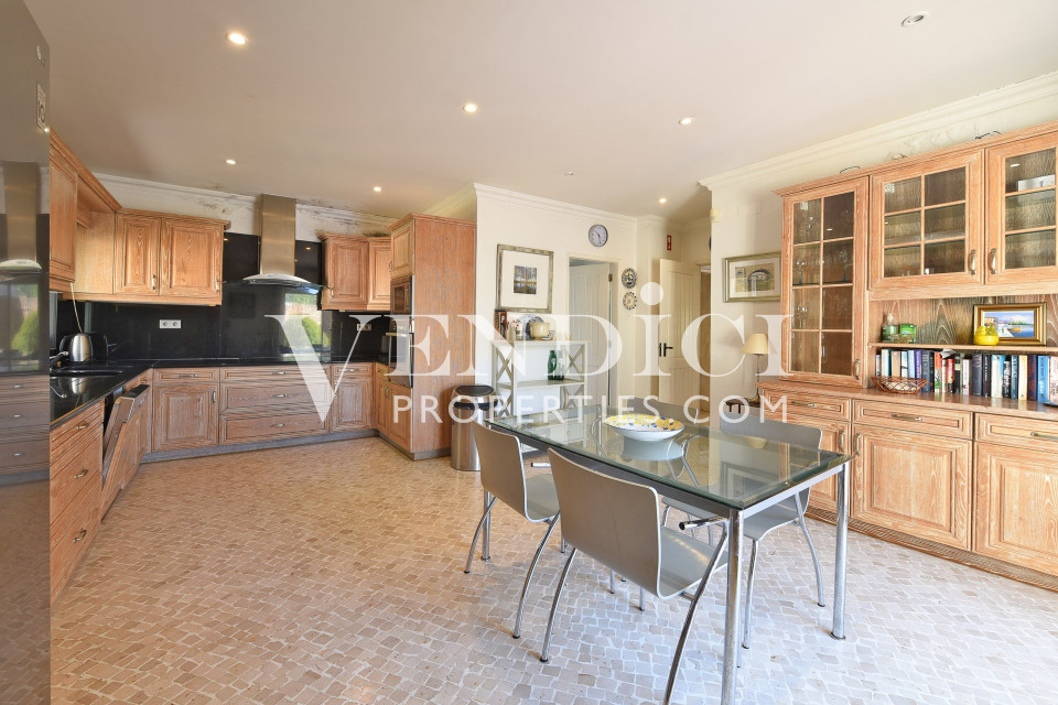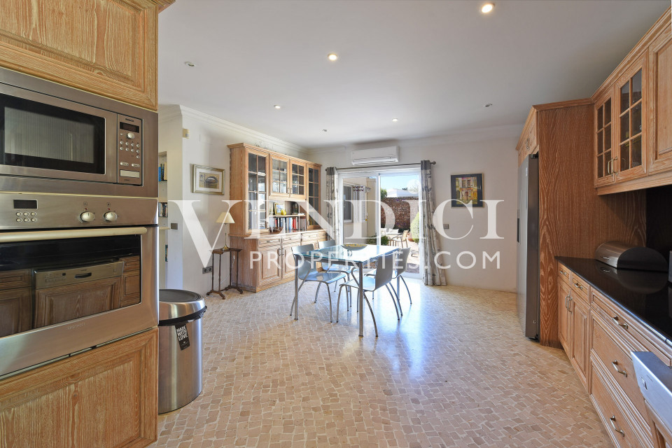 The ground floor features a bright and comfortable living and dining area with large windows that allow natural light to flood the space while offering views of the garden and pool area. The kitchen connects conveniently to the living areas and outdoor terraces, providing an ideal setting for both everyday living and entertaining.