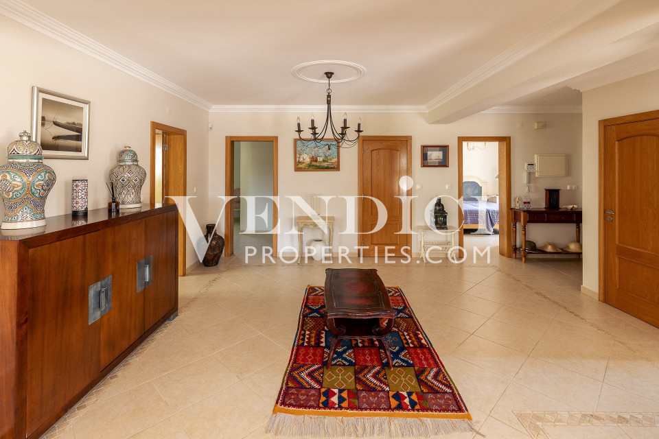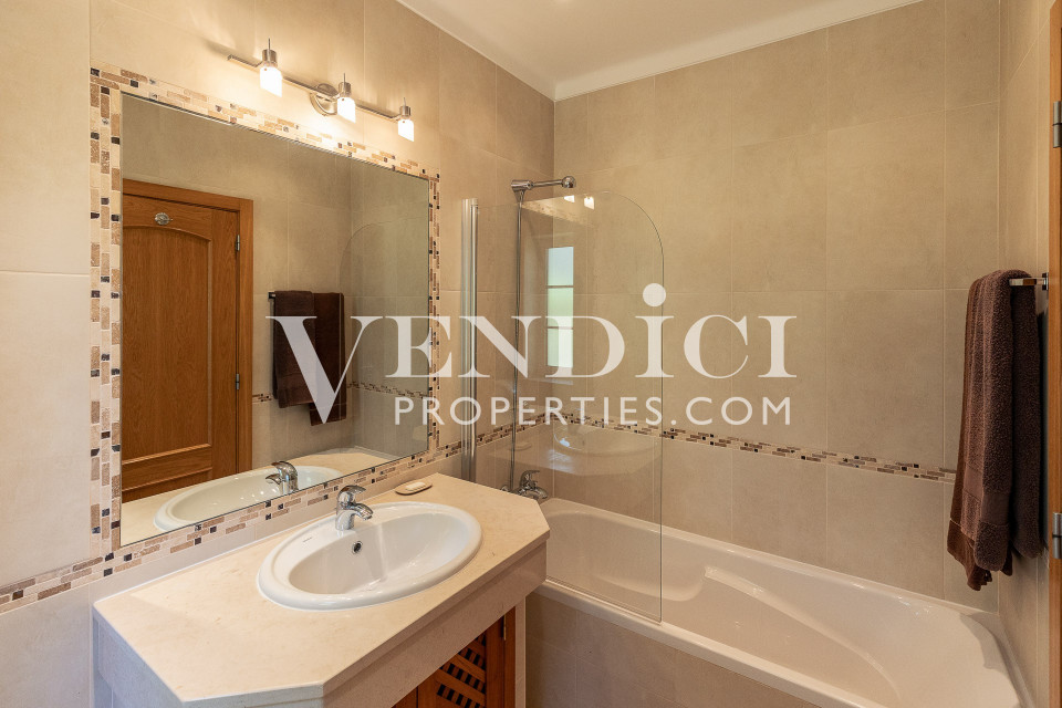 On the ground floor, the villa welcomes you with a spacious entrance hall that leads to two comfortable en-suite bedrooms, a guest bathroom, a storage room, and a fully fitted kitchen with direct access to both the dining area and the garden. The bright and generously sized living and dining room features a fireplace and opens through large sliding doors onto the south-facing pool terrace — perfect for making the most of the Algarve’s sunny climate.